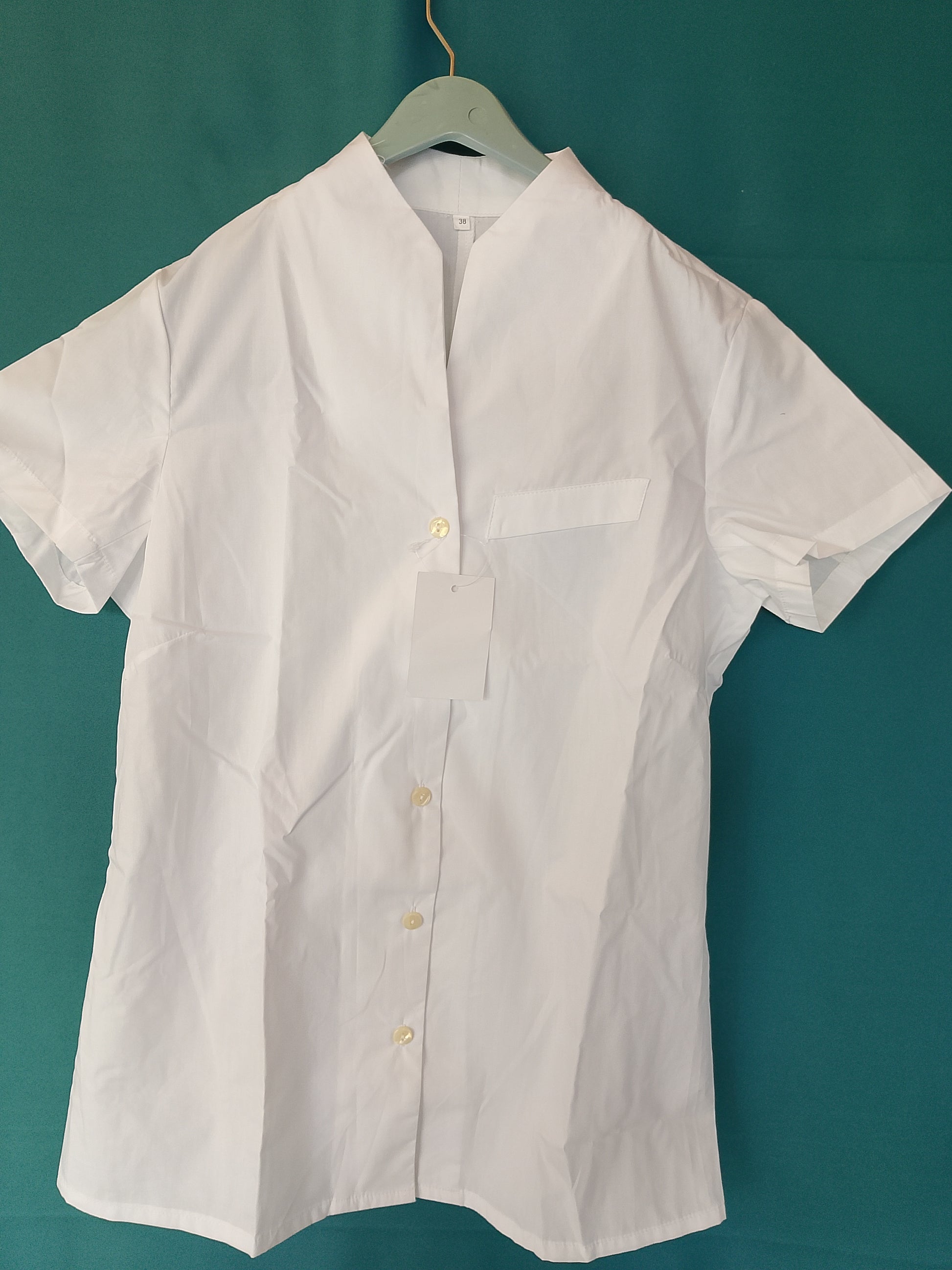 Această cămașă albă, cu mânecă scurtă, se remarcă prin gulerul său tip "chinezesc" sau "tunică", care oferă un look modern și minimalist. Design-ul este ideal pentru a fi purtat atât la ținute casual, cât și la cele smart-casual, putând fi asortat cu blugi, pantaloni din pânză sau chiar fuste. Produsul este în stare nouă, cu etichetă. Croiala este potrivită atât pentru bărbați, cât și pentru femei.