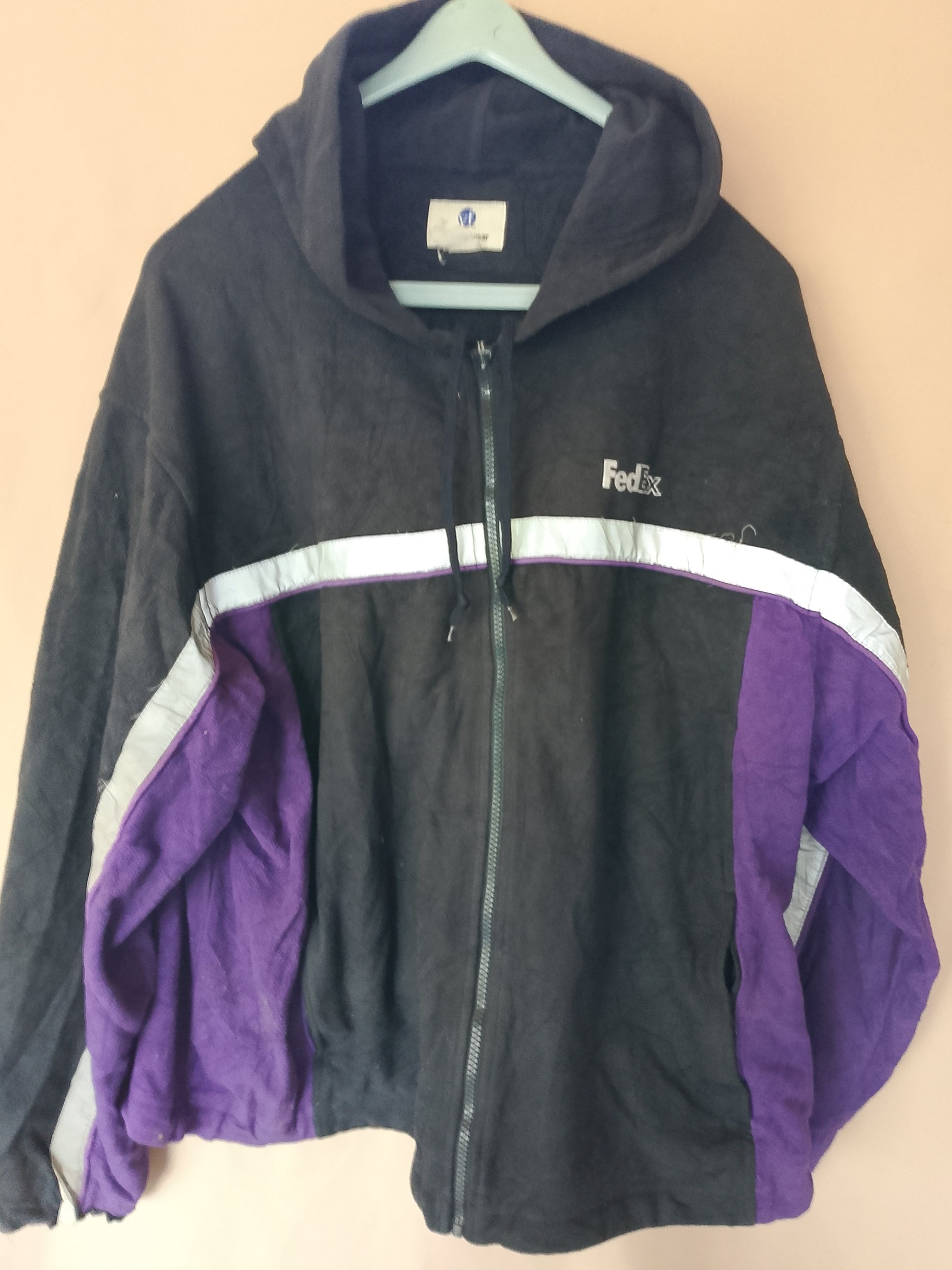 Adaugă un strop de originalitate stilului tău casual cu această geacă de fleece cu glugă, un articol vestimentar cu un design unic, purtând logo-ul iconic FedEx. Perfectă pentru zilele mai răcoroase, această geacă îți oferă confortul și căldura de care ai nevoie, fiind totodată o piesă statement. Culorile contrastante, negru și mov, și benzile reflectorizante îi conferă un aer distinctiv, inspirat de estetica anilor '90. Este un articol de colecție, greu de găsit, ideal pentru cei care apreciază hainele vintage și vor să se remarce. Fermoarul este defect. Nu coboara. Geaca este destul de uzata.