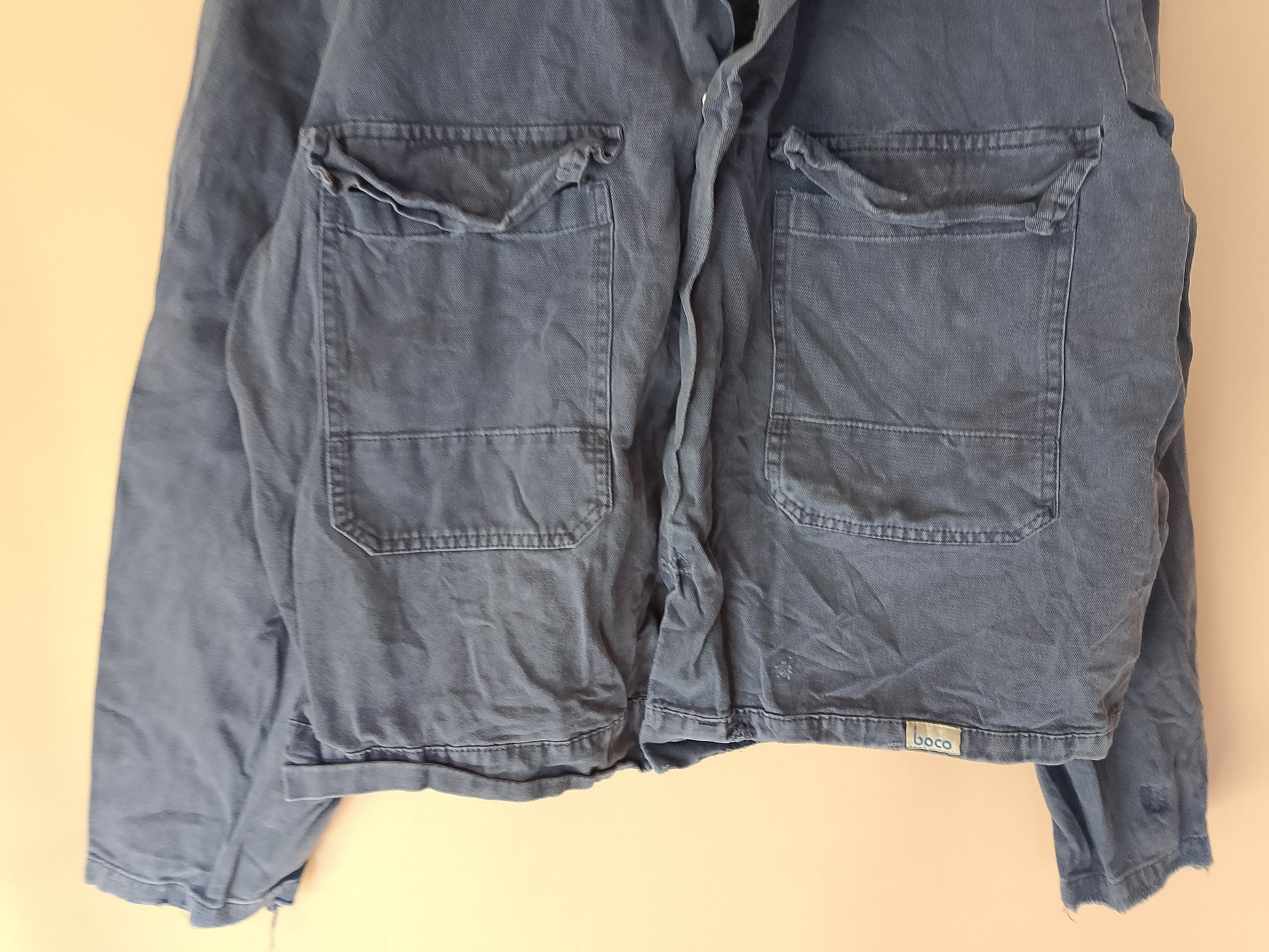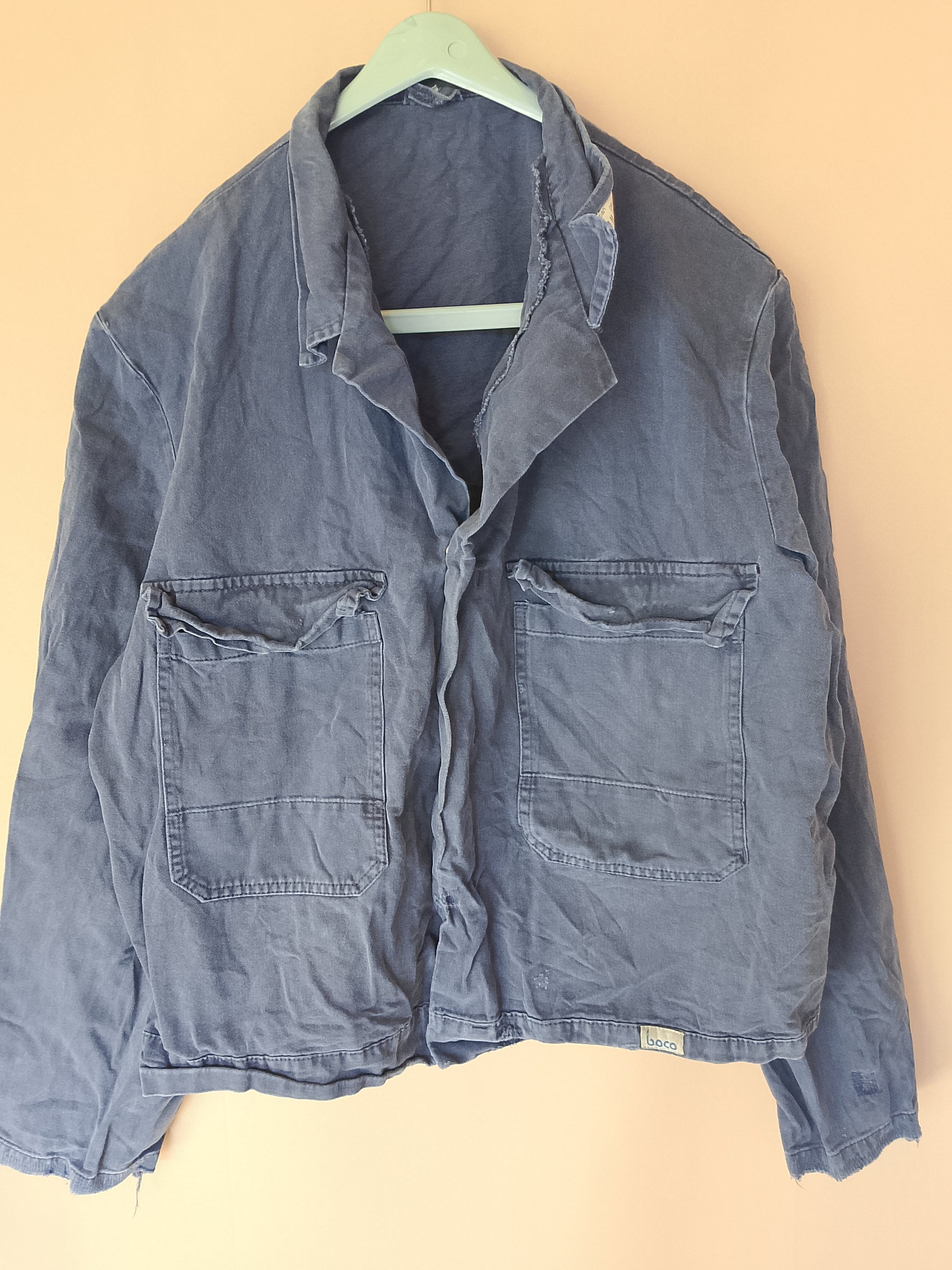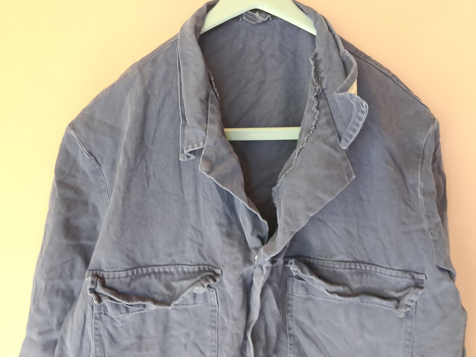Ești în căutarea unei jachete de lucru cu un caracter unic? Această jachetă second-hand are o poveste de spus! Cu un design clasic, plin de buzunare, este o piesă ideală pentru orice proiect manual, de la mecanică la grădinărit. Culoarea sa albastră uzată îi conferă un aspect vintage, autentic, iar urmele de utilizare îi confirmă durabilitatea.