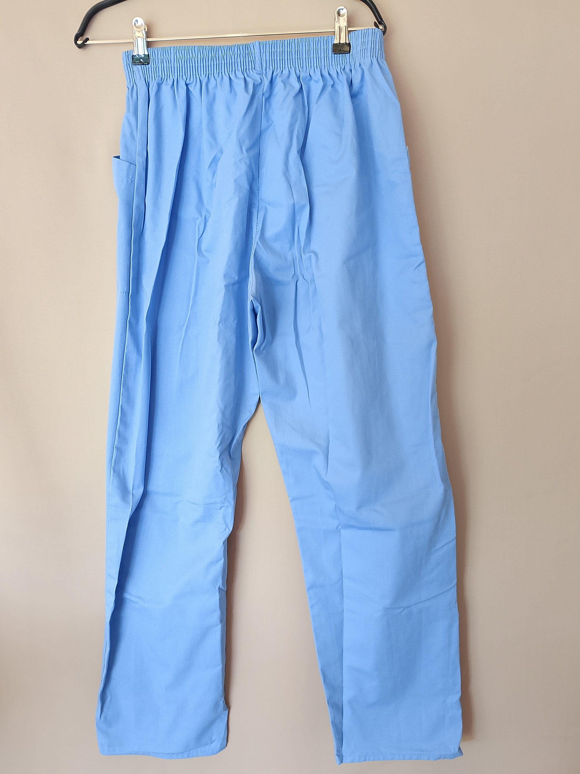 Acești pantaloni medicali unisex, de culoare albastru deschis, sunt o alegere excelentă pentru personalul din domeniul sănătății. Confecționați dintr-un material respirabil și durabil, asigură confortul necesar pe parcursul orelor lungi de muncă. Talia elastică oferă o ajustare perfectă, iar buzunarele laterale adaugă un plus de funcționalitate, fiind practice pentru a ține la îndemână instrumente sau obiecte personale. Starea produsului este excelentă, ca nou, fără urme de uzură. Un element vestimentar esențial pentru medici, asistenți medicali sau orice alt specialist din sectorul sanitar.